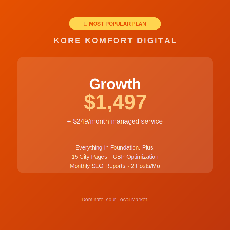 The most popular Kore Komfort Digital plan. Everything in Foundation plus 15 city pages, Google Business Profile optimization, competitor analysis, monthly SEO reporting, and 2 content posts per month. Built for established contractors ready to own their local market.