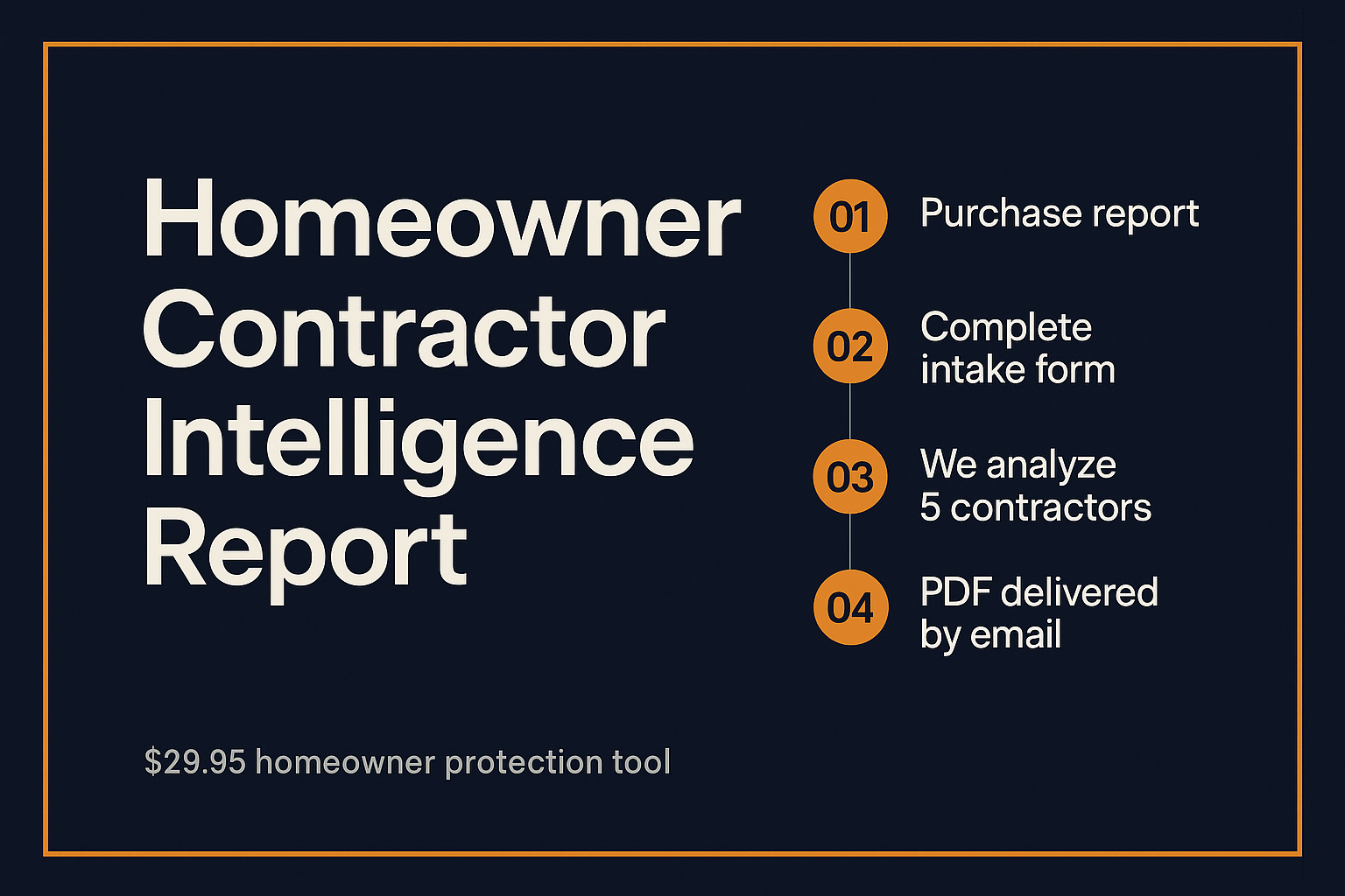 The Homeowner Contractor Intelligence Report gives you an unbiased side-by-side look at 5 contractors before you sign anything. Permit history, licensing, BBB status, reviews, digital presence, and the facts most homeowners never see until it’s too late.