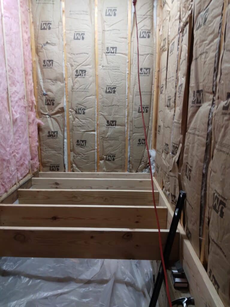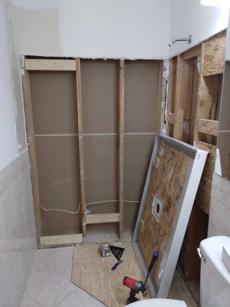 The project began with a complete gut renovation. I installed floor joists and subflooring to create a solid foundation where none existed. After completing the necessary plumbing and electrical work, I added ceiling joists, drywall, and tile backer board to prepare the space for its final finishes.