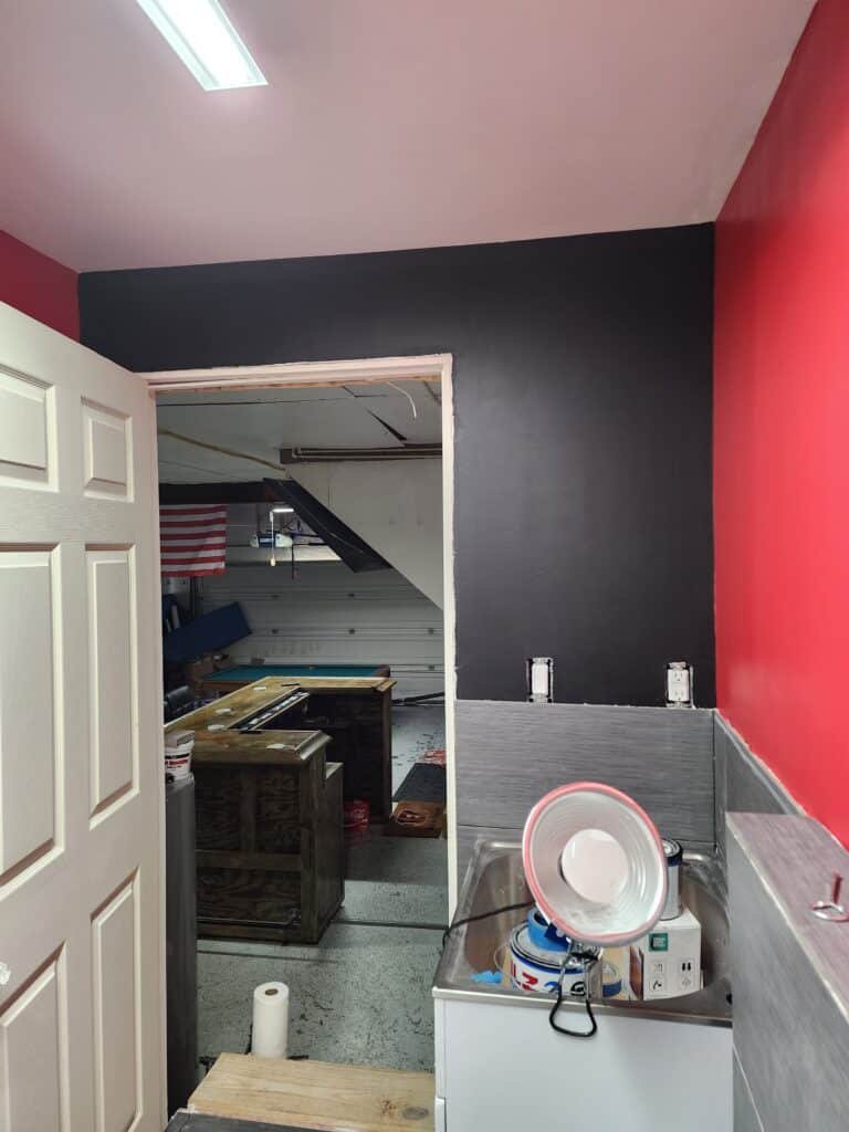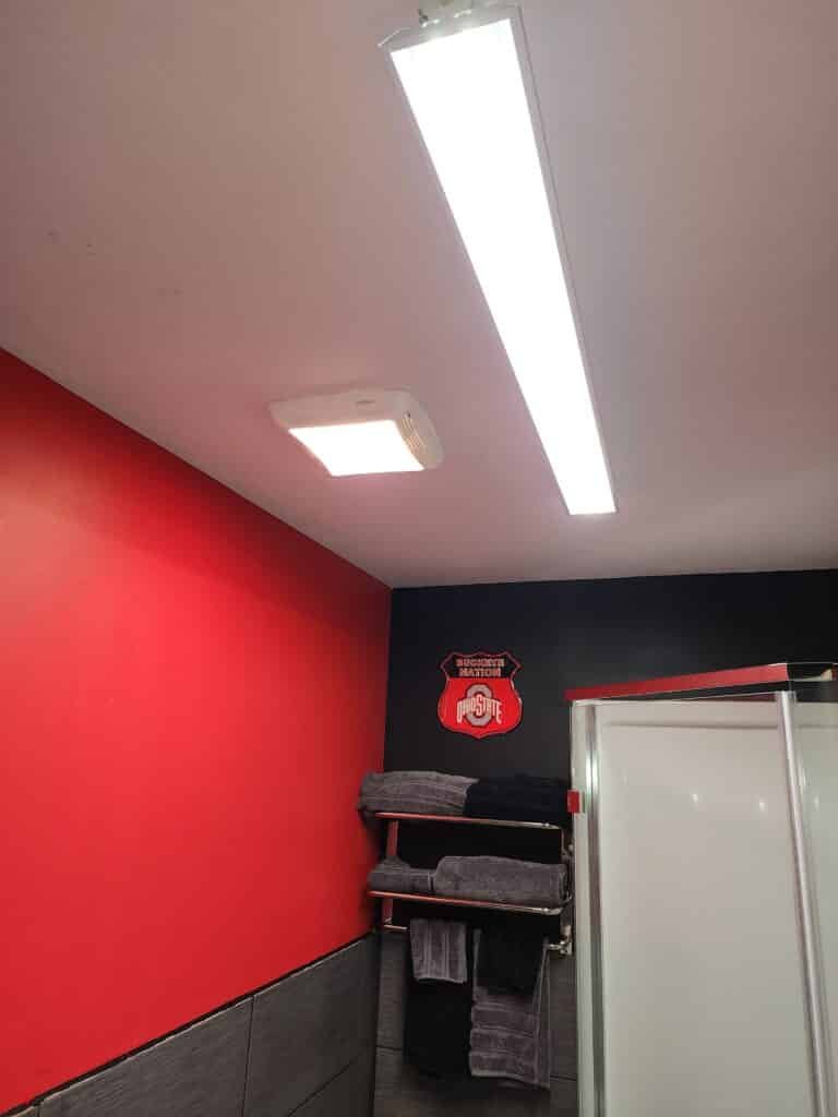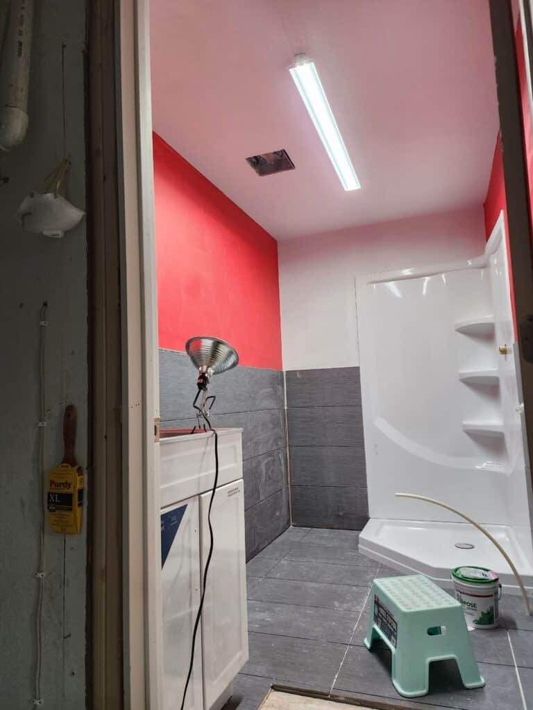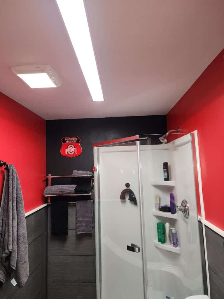 The design showcases true Buckeyes spirit with gray tile extending halfway up the walls, complemented by Ohio State red paint above—a perfect representation of the team’s iconic colors. The bathroom features a modern neo-angle shower, toilet, and urinal, plus a stylish vanity and sink. To ensure endless hot water during those long game-day gatherings, I also installed a dedicated gas water heater exclusively for the bathroom.