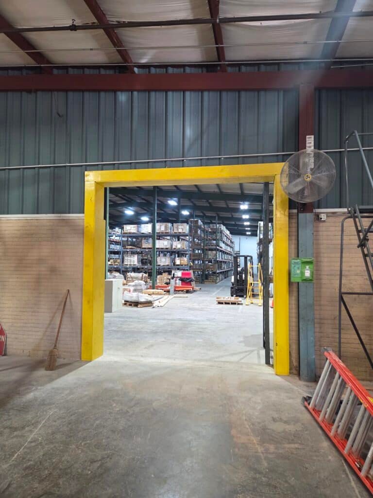 By Monday morning, the warehouse was back to full operation with a new, efficient pathway for material movement. The safety yellow trim provides excellent visibility, and the structural framing ensures the opening will serve the facility for years to come.